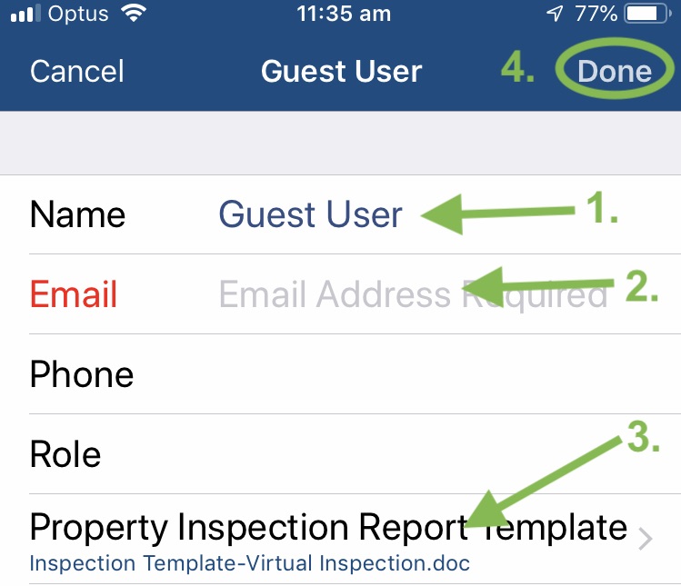 Step 9: Tap ‘Guest User' (1) and update with your Full Name and Email address (2). Tap on Property Inspection Report Template (3) and select Inspection Template-Virtual Inspection.doc and hit Done (4).