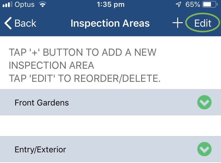 Step 9: In the Inspection Areas screen, using the Edit and the "+" button in the top left, Add or Delete areas to match the inspection areas that your Property Manager has emailed you.