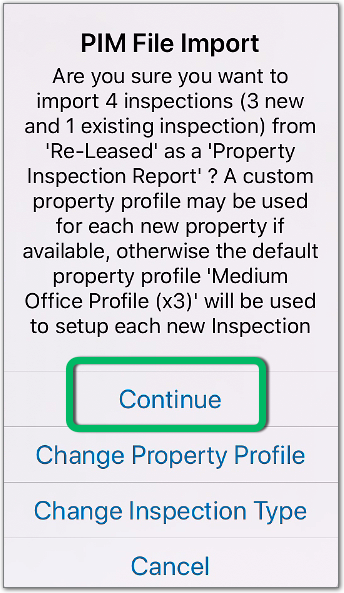The import will create inspections based on the profile and inspection type set in Re-Leased. where available otherwise will use the PIM default. If you are happy with this, tap Continue. |