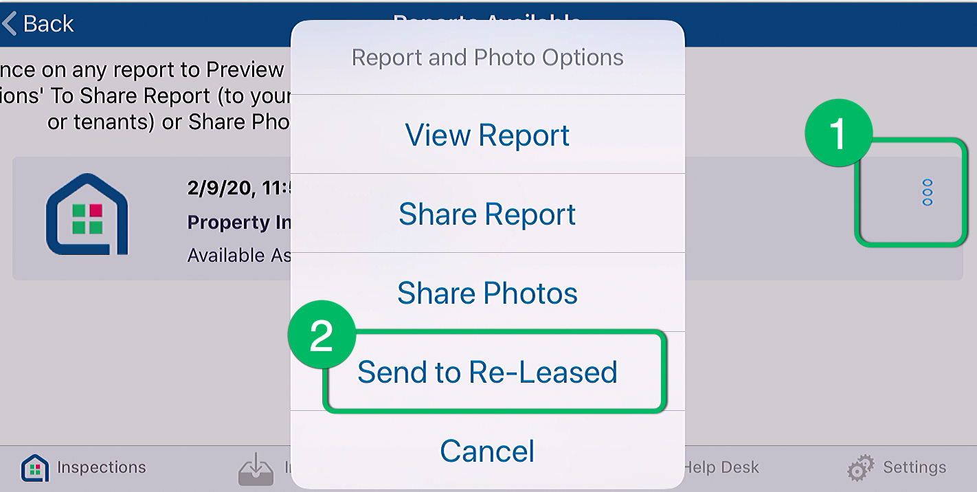 If for some reason you only previewed the inspection rather than Submit, or need to re-send to Re-Leased, this can easily be done from the home screen of the inspection.