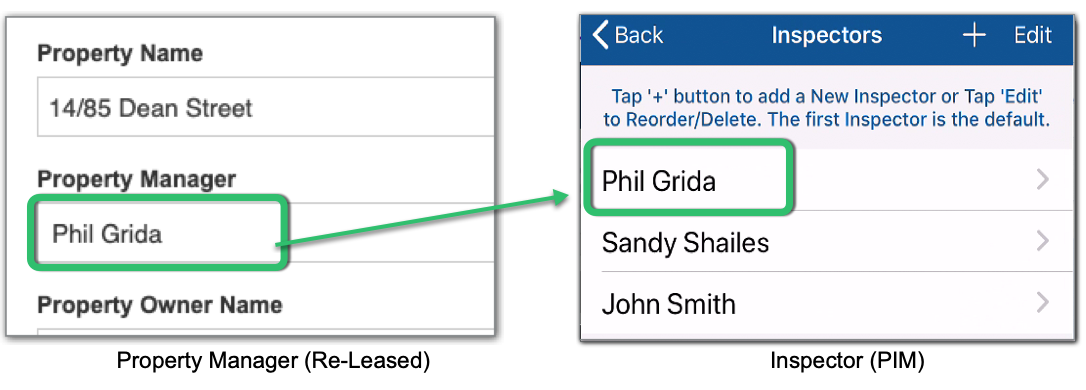 | Inspections can only be imported against the Re-Leased Property Manager if there is a corresponding Inspector name in PIM. If an exact match is not located, PIM will use the Default Inspector instead. Add or edit inspectors in Settings > PIM Admin > Inspectors. See the Adding Inspectors Guide for more information. |