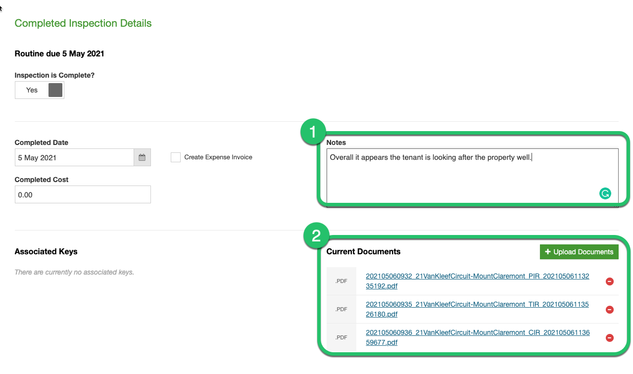 Notes (1) will be updated from the Our Summary field in the PIM inspection and a PDF copy of the report will be in Current Documents (2).