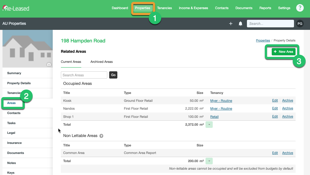 | During the import, PIM will use the Usage Type assigned to a Property in Re-Leased. If set to Commercial, more data will be imported into PIM specifically the size of the area which is tenanted (set within the Area section of your Property in Re-Leased) and will be shown in your Lease Details field in PIM. |