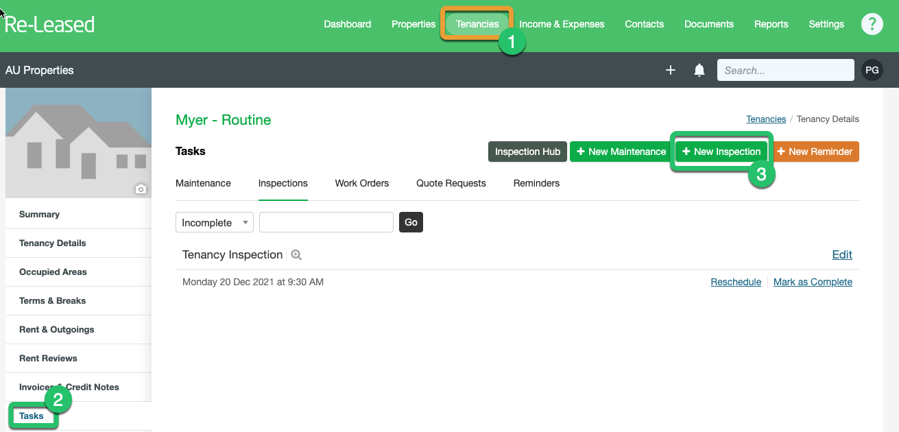 | To schedule a Leased Property tap on Tenancies (1) then select your Tenant from the list. Then tap on Tasks (2) then tap on + New Inspection (3). On the new screen that is shown, as below, give your inspection, a Title (not used in PIM ) then select the Inspection Type (i.e. Property Inspection) and enter a Due Date (Inspection Date) and Time. The Tenancy should have been already selected. NB: Where you have multiple tenancies, the inspection TIME must be unique. ie. 9-10 am, 10-11 am