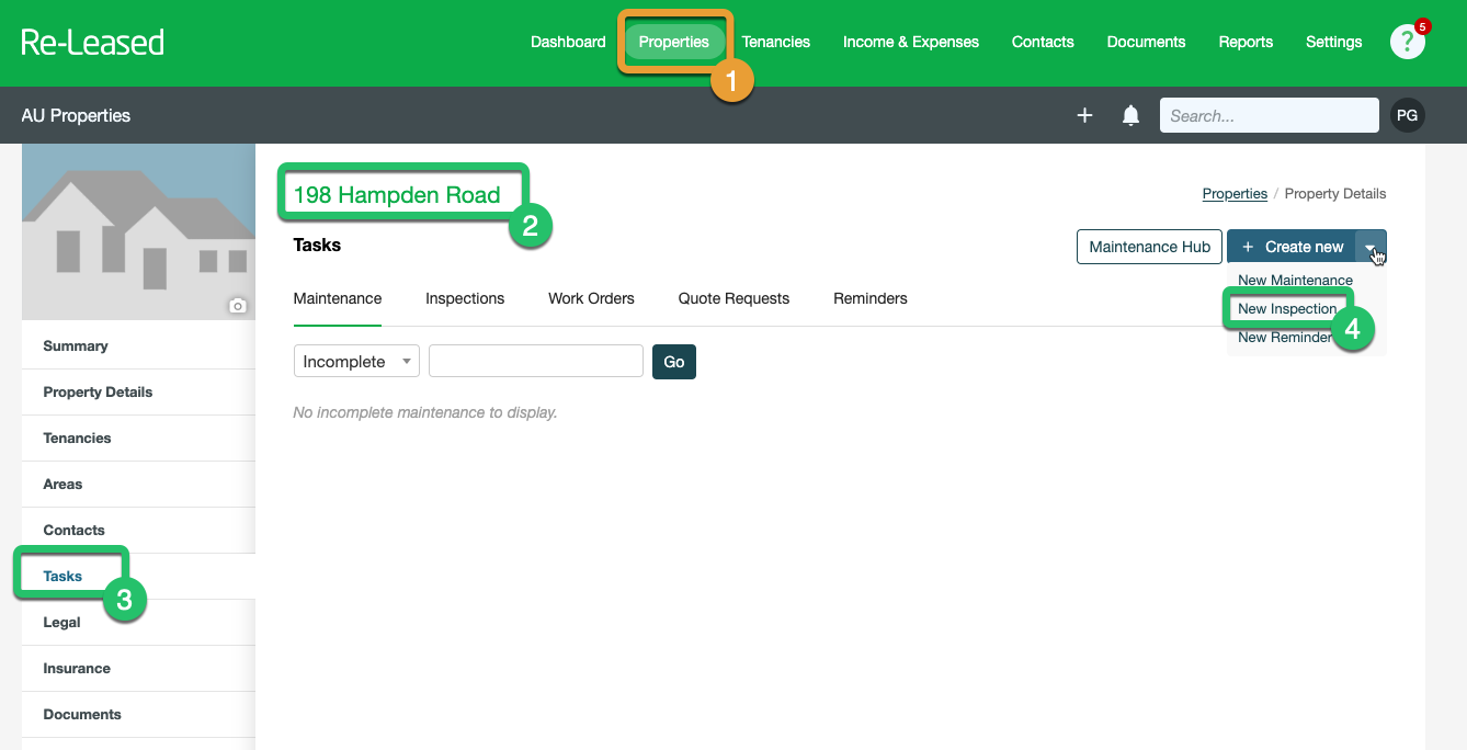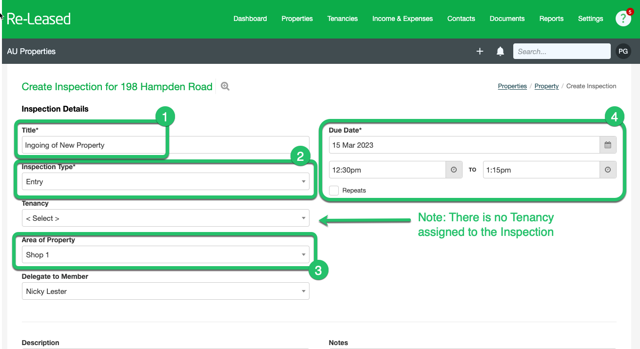 | To schedule an inspection against the Property tap on Properties (1) then select your Property Address (2) from the list. Then tap on Tasks (3) then tap on + New Inspection (4) ![]() On the next screen, give your inspection a Title (1) — this field isn’t used in PIM — then select the Inspection Type (2) such as Routine. Choose an Area of the Property (3) if applicable, or leave it blank, then enter the Due Date (inspection date), Time (4), and who the inspection is assigned to in the Delegate To Member (5) field. For the Delegate To Member field, PIM will automatically match the name with an existing inspector in your PIM account (typically the same person who is authenticated with Re-Leased in the PIM app). If no match is found, the default inspector will be used instead. You can manage or update your inspectors in Settings > PIM Admin > Inspectors and Templates.