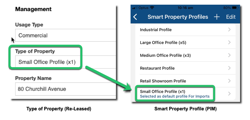 | Your scheduled inspection in Re-Leased will have a Property Type, ie. House, or Small Office Profile (x1). PIM will look for the same name in the Smart Property Profiles, and use the areas within that profile to create your inspection. If there is no match then PIM will import and set up your new inspection as the default profile set in PIM. You can review these in Settings > PIM Admin > Smart Property Profiles. ![]() To set up your PIM Smart Property Profiles to match Re-Leased, see the Smart Property Profiles Guide for more information. |