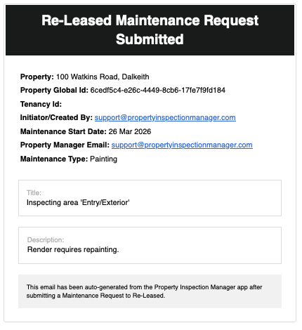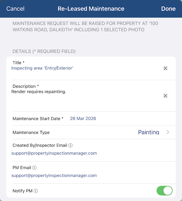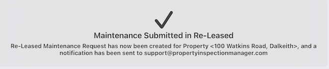 | This presents the Maintenance Request screen where you can fill in more details: Title - Defaults to the Inspection Area where the image was taken. Edit as required. Description - Enter notes detailing more information about the maintenance needing to be done. Due Date - Defaults to tomorrow's date, however, change as needed. Maintenance Type - Select the type of Maintenance required - Electrical, Painting, Gardening etc Here's a cleaned-up version: PM Email — This defaults to the email address of the property manager assigned to the inspection in Re-Leased, but can be updated if needed. Notify PM — Turn this on to automatically send the property manager an email notification as soon as the maintenance request is raised. Property Global Id and Tenancy Id: These match up to Id's used in Re-Leased. Anything with an asterisk * is required before tapping Done. Once you tap Done you will see the confirmation that your Maintenance Request has been successfully sent to Re-Leased. Just tap OK!![]() If the Notify PIM option has been turned on, the property manager will have received an email notification similar to the example shown below. ![]() |