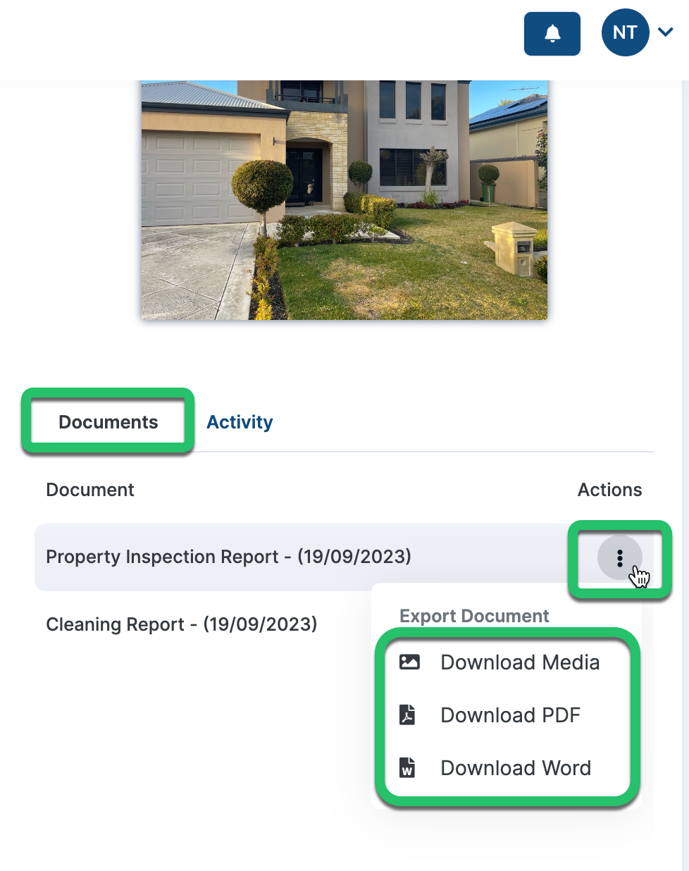C: Documents: This section displays the available reports for this inspection and provides the option to download the media, PDF, and Word files of your inspection to your desktop or computer."