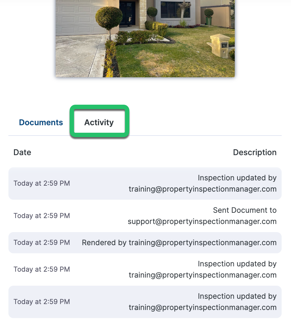 D: Activity: View a record of your submitted inspections, including information on who sent them and when they were edited.