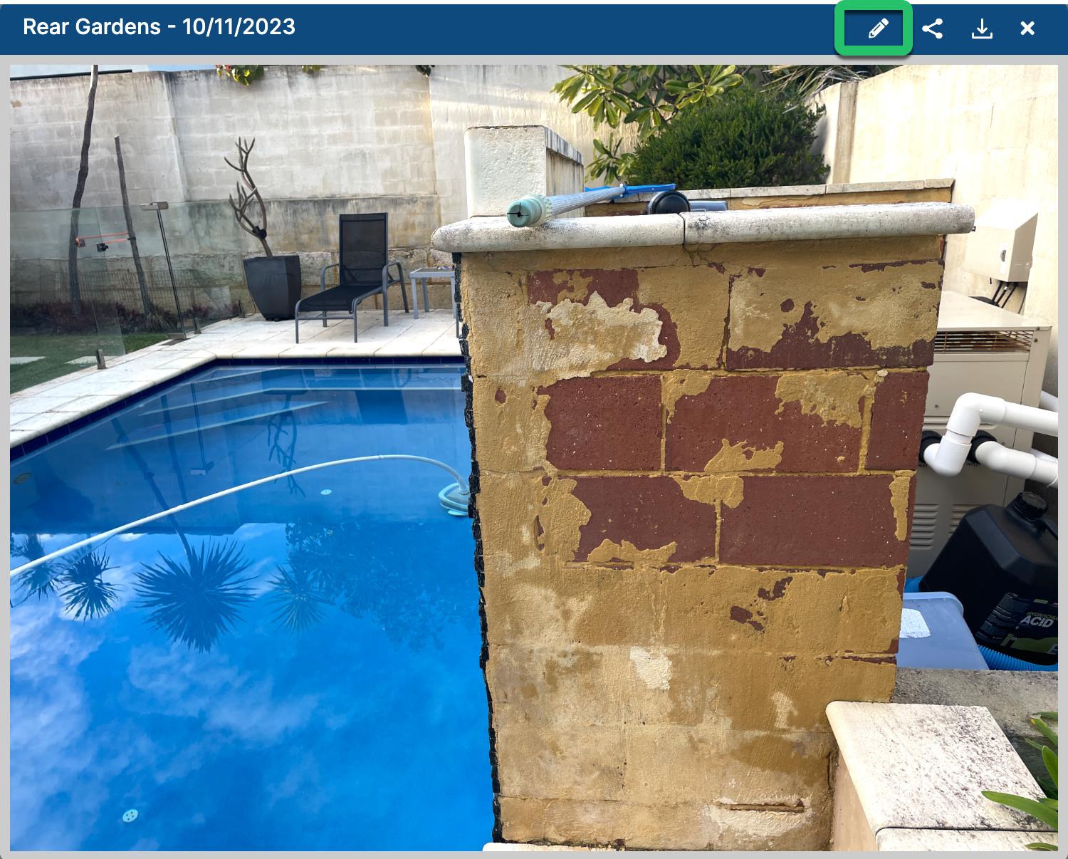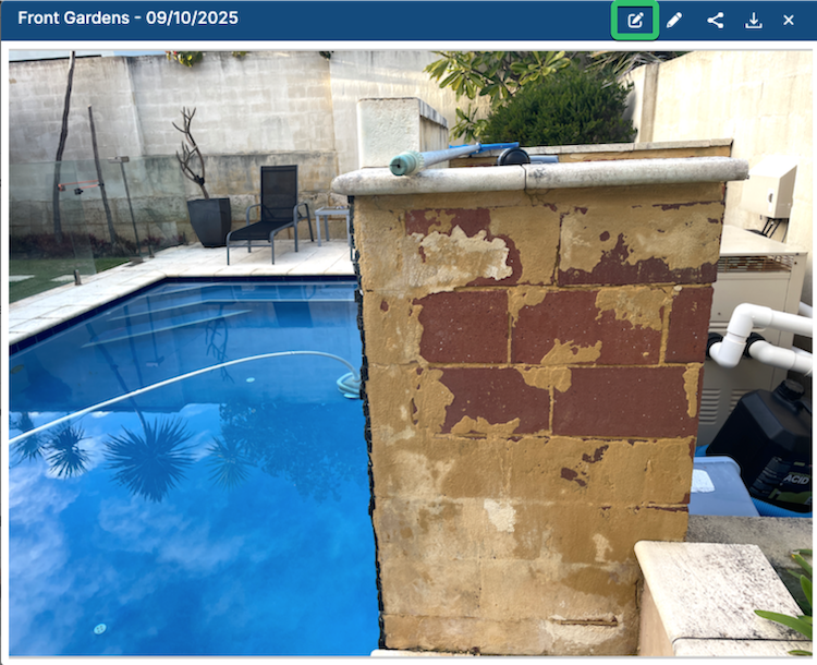 When working with any media item linked to an Area or Sub Inspection Area, simply tap on the item to open a popup menu with several options: Annotate, Edit, Share, or Download. You’ll find these options represented by the white icons in the toolbar.