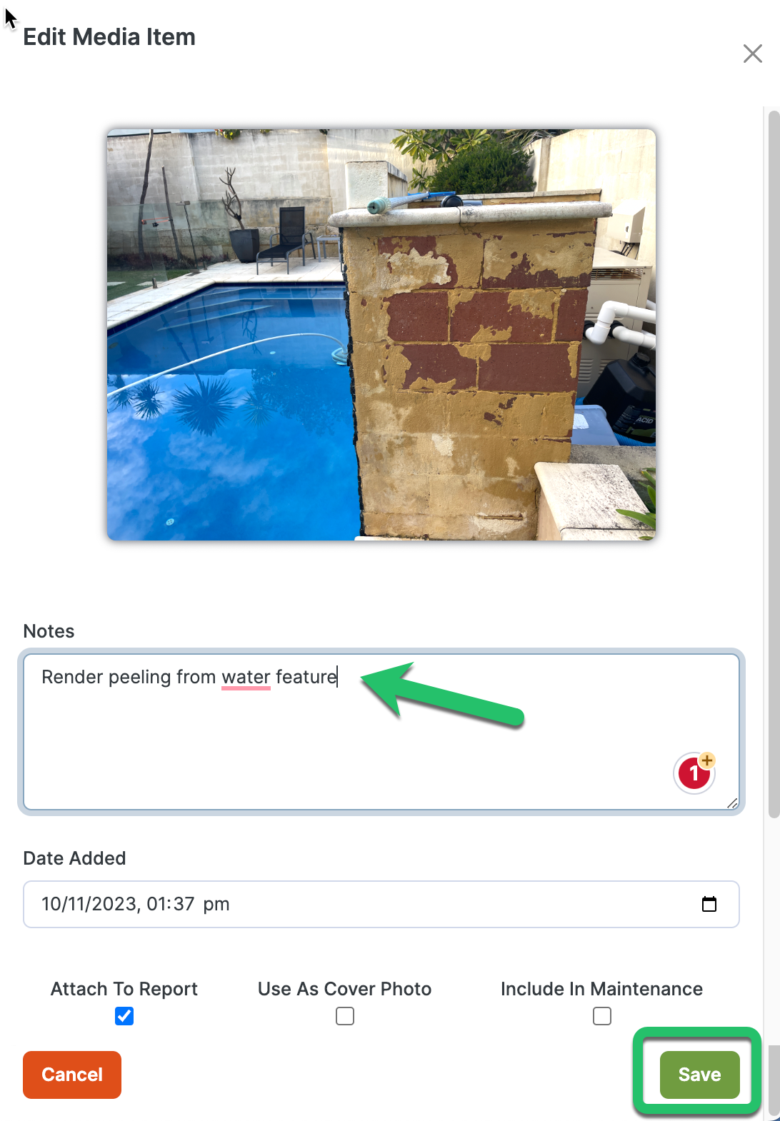 Here you can add notes, opt to set it as a Cover Photo or Include In Maintenance. Simply tap 'Save' to preserve any changes.