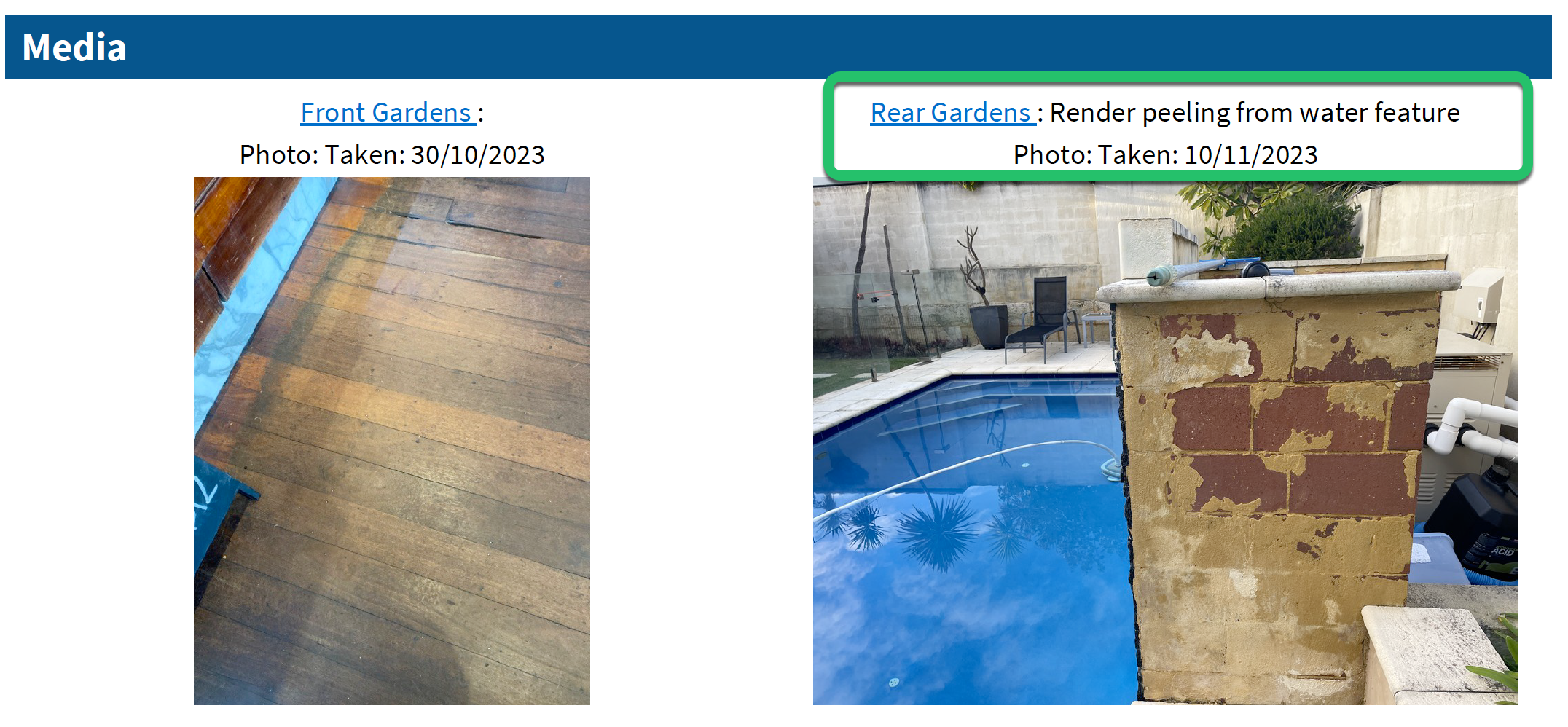 B: Access the Media Gallery to view all photos and videos for an inspection presented as a slideshow. This feature offers options to download individual high-resolution photos or videos and provides information about the location where the media was recorded. View a sample inspection report, and media gallery, via our Report Gallery.