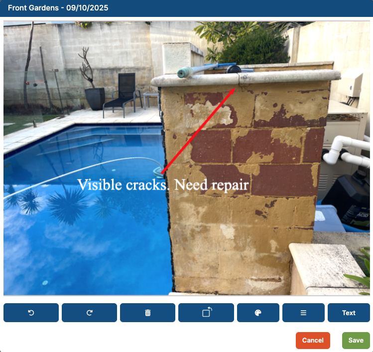 A handy new feature is the ability to Annotate the Photo just like you can in the PIM app itself. Here you can easily highlight areas using symbols, lines, arrows, and text — perfect for drawing attention to items that require maintenance or further inspection. You can even rotate photos if they were taken upside down! Just tap the Annotate icon to get started!