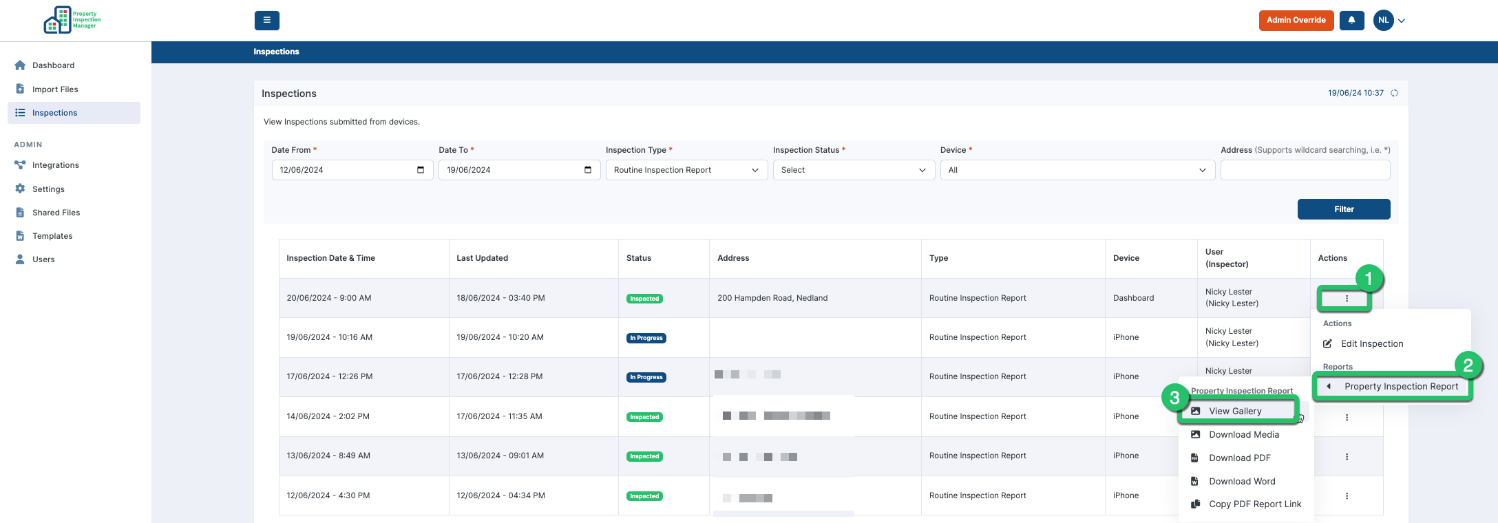 The Cloud Dashboard allows you to view all your images from a "Submitted Report" or a "Save and Preview" Report in one screen. To do this you log into your Cloud Dashboard and then under the Actions column tap the "3 Dots" (1) and then select your inspection to view "Property Inspection Report/or Condition Report" (2) and then tap "View Gallery" (3).