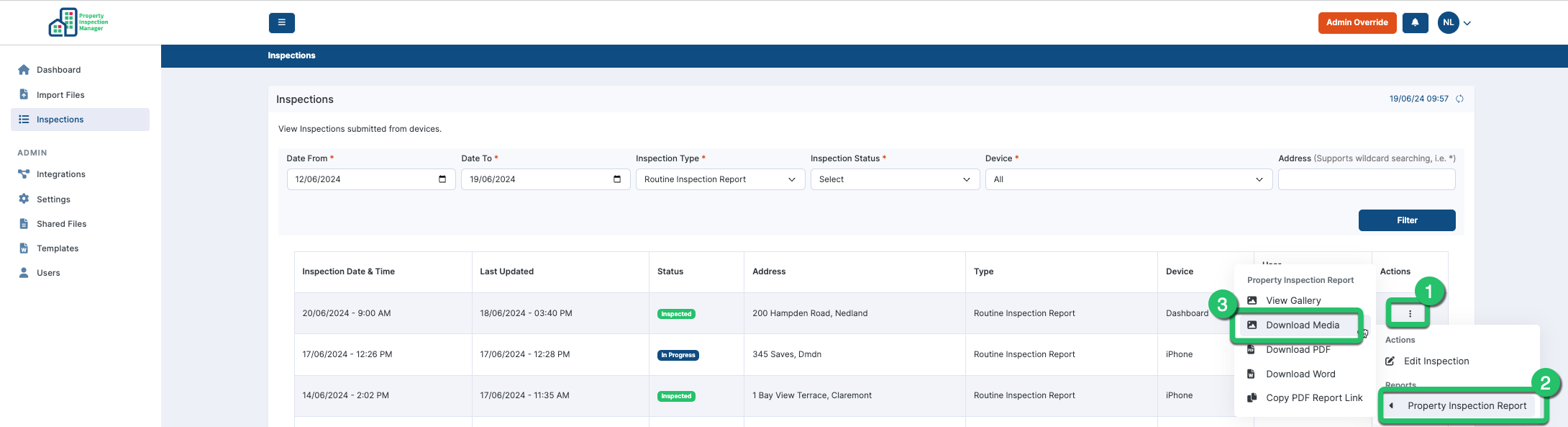 If you would like to download all your high-resolution images in one batch you can do so from the Dashboard by tapping the "3 Dots" (1) under the Action column and then select your inspection either "Property Inspection Report/or Condition Report" (2) and then tap "Download Media" (3).